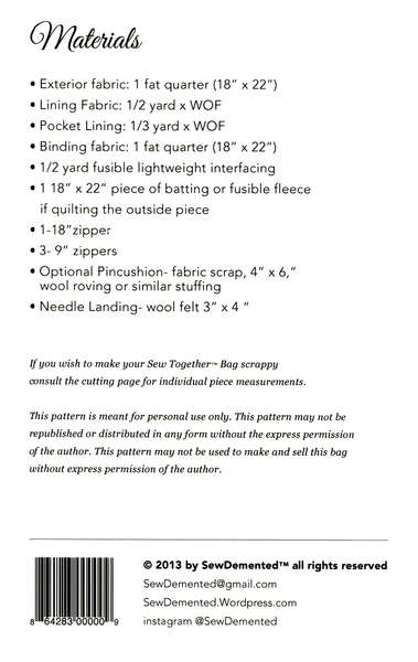 I had been eyeing up the sew together bag . 10in x 5in x 5in. The sew together™ bag is a nifty little bag with three zippered pockets, four open pockets, a pincushion and a great little needle landing all held together .